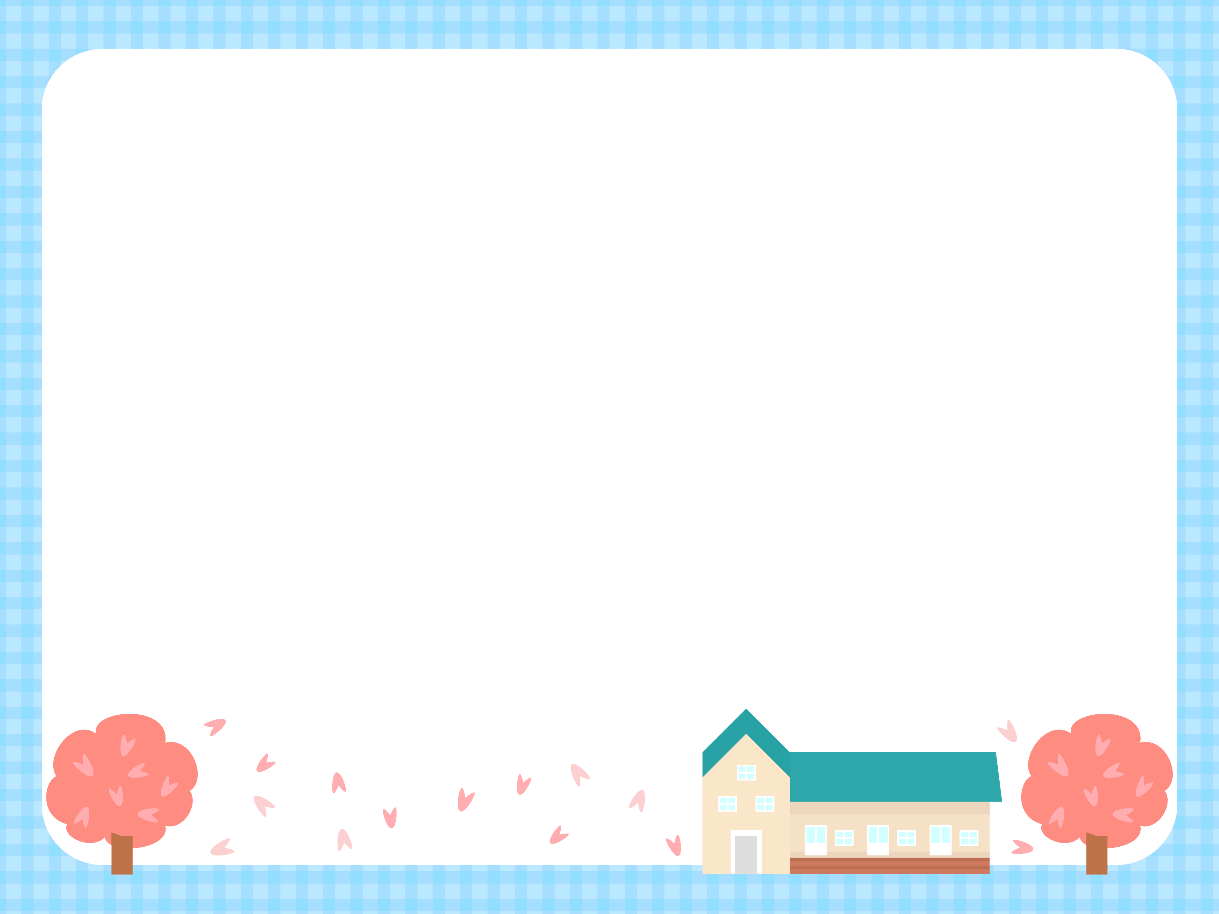 桜と学校-園舎の水色チェック模様フレーム飾り枠