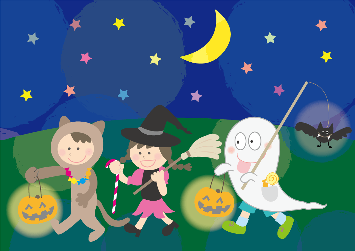 かわいいハロウィンの仮装をした子供たちが、お菓子をもらいに歩く秋