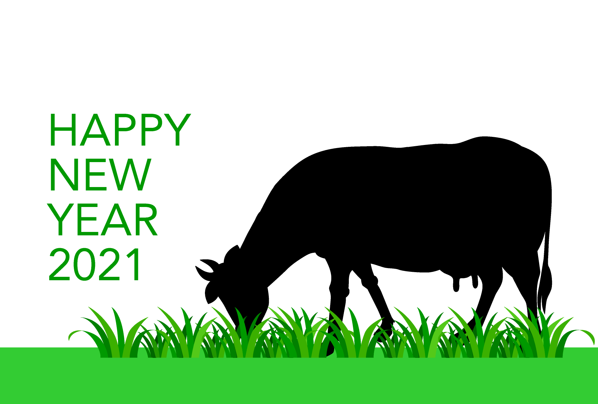 モノクロの線画の牛(正面向きの顔)と賀詞と富士山-2021-かわいい丑年