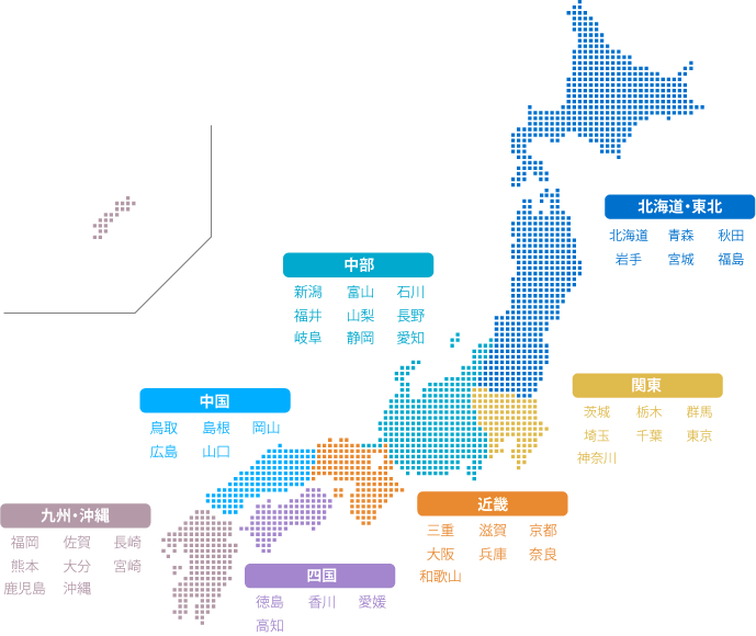 地方エリア分け都道府県名入りドットの日本地図(ベクターデータ)