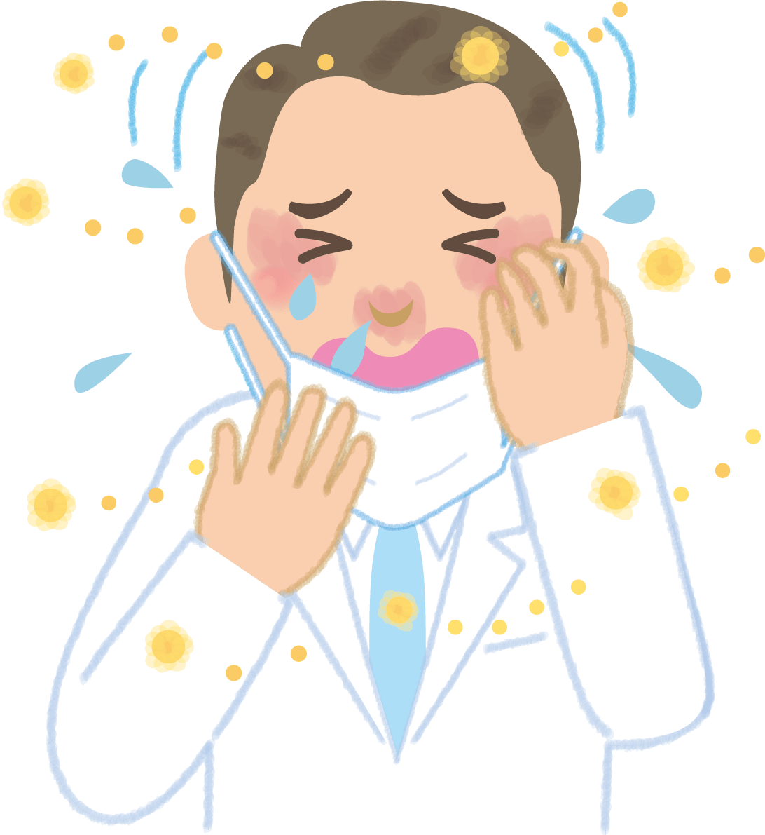 医師の花粉症-イラスト(マスク-くしゃみ-鼻水-目の痒み)